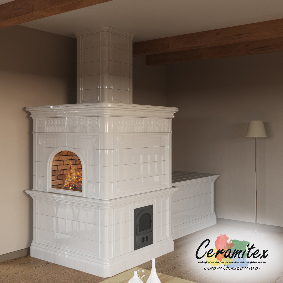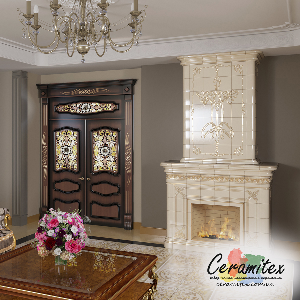 - Дымоход. Сделан в виде простого прямоугольного короба, который не отвлекает внимание от декоративной нижней части камина и эффектно её оттеняет. Чтобы усилить контраст, при этом сохранить богатый внешний вид модели, мы облицевали дымоход изразцами под светлый «натуральный мрамор». Плитку сделали абсолютно гладкой, покрыли глазурью с легким лоском.
