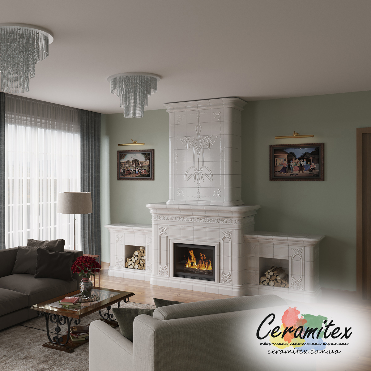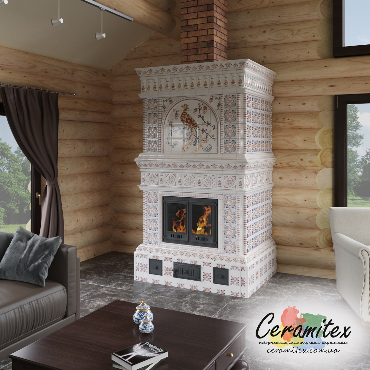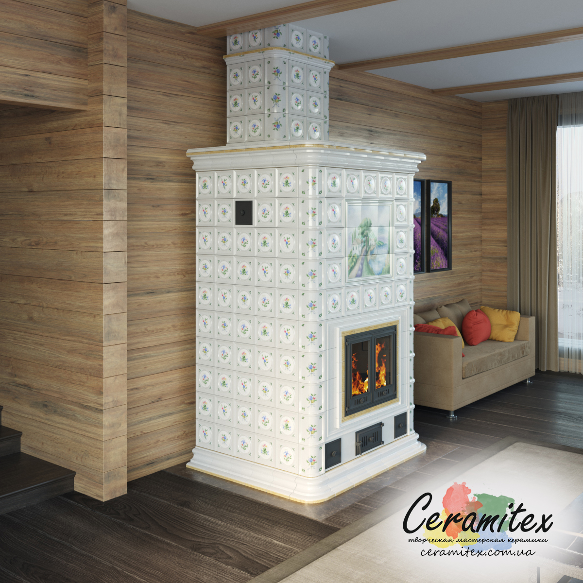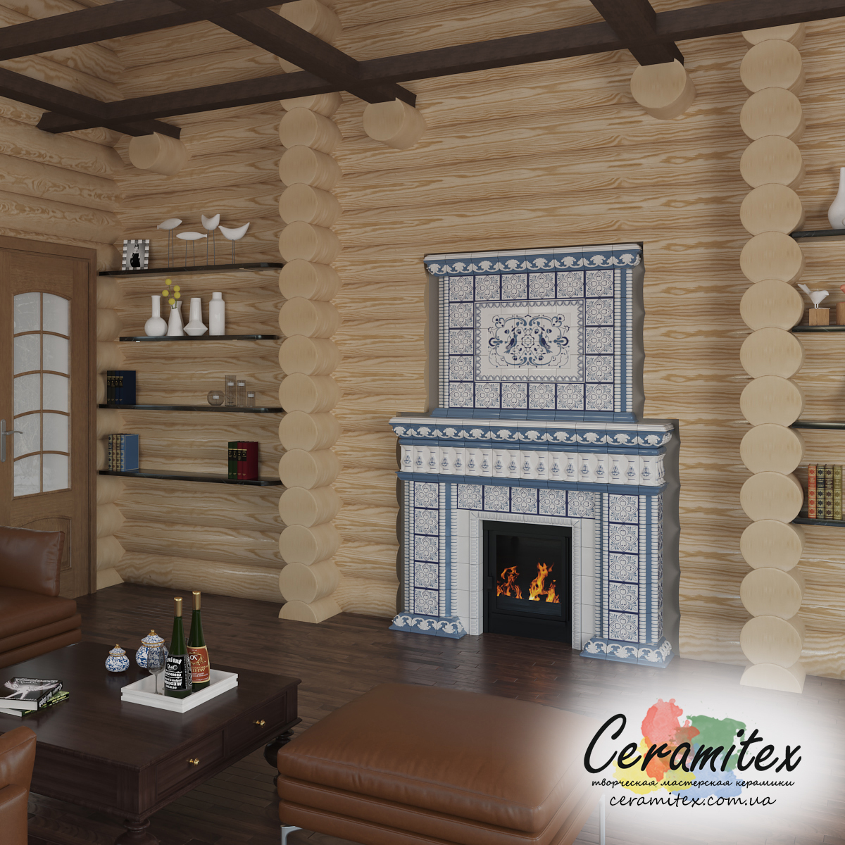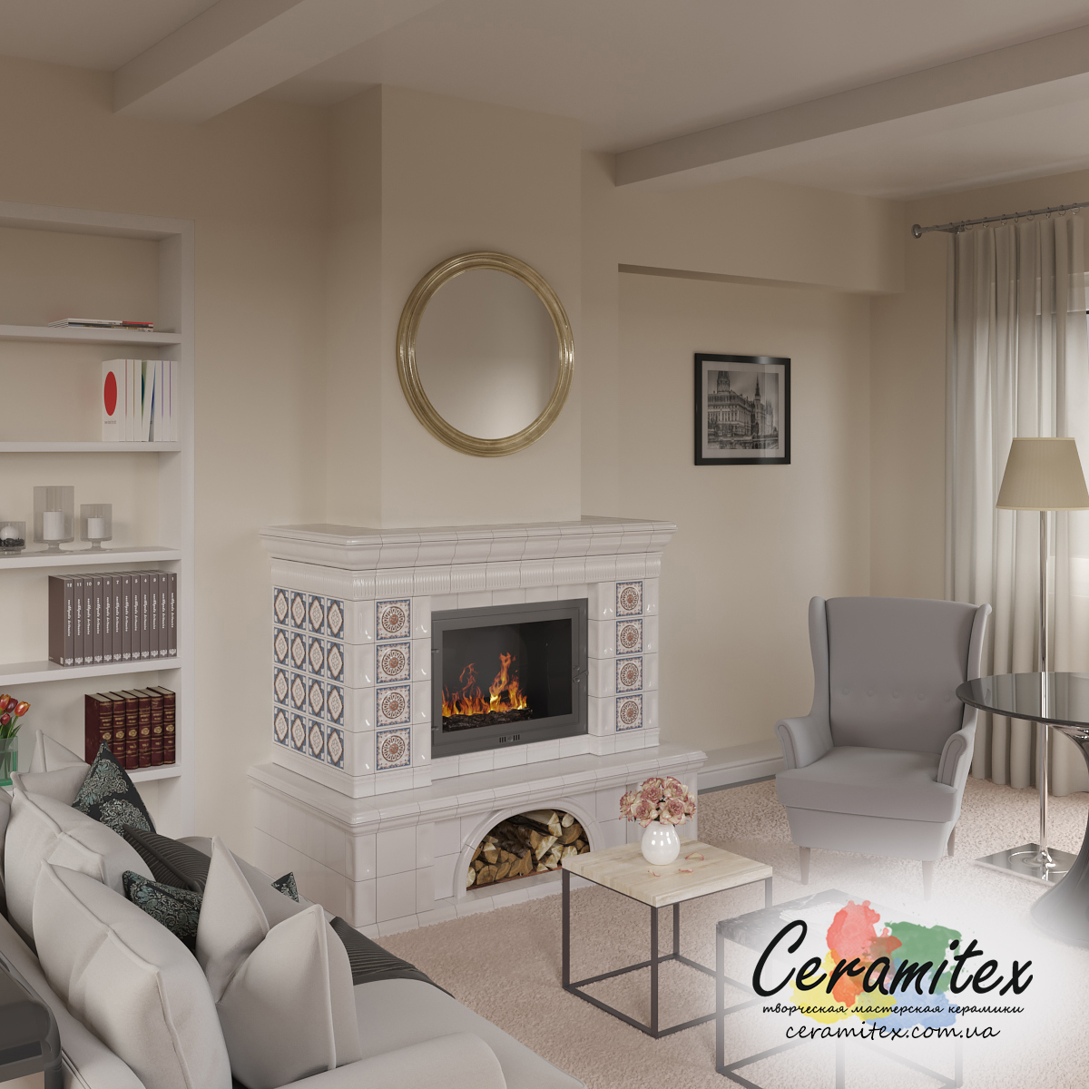 Примеры изразцовых каминов в различных интерьерах