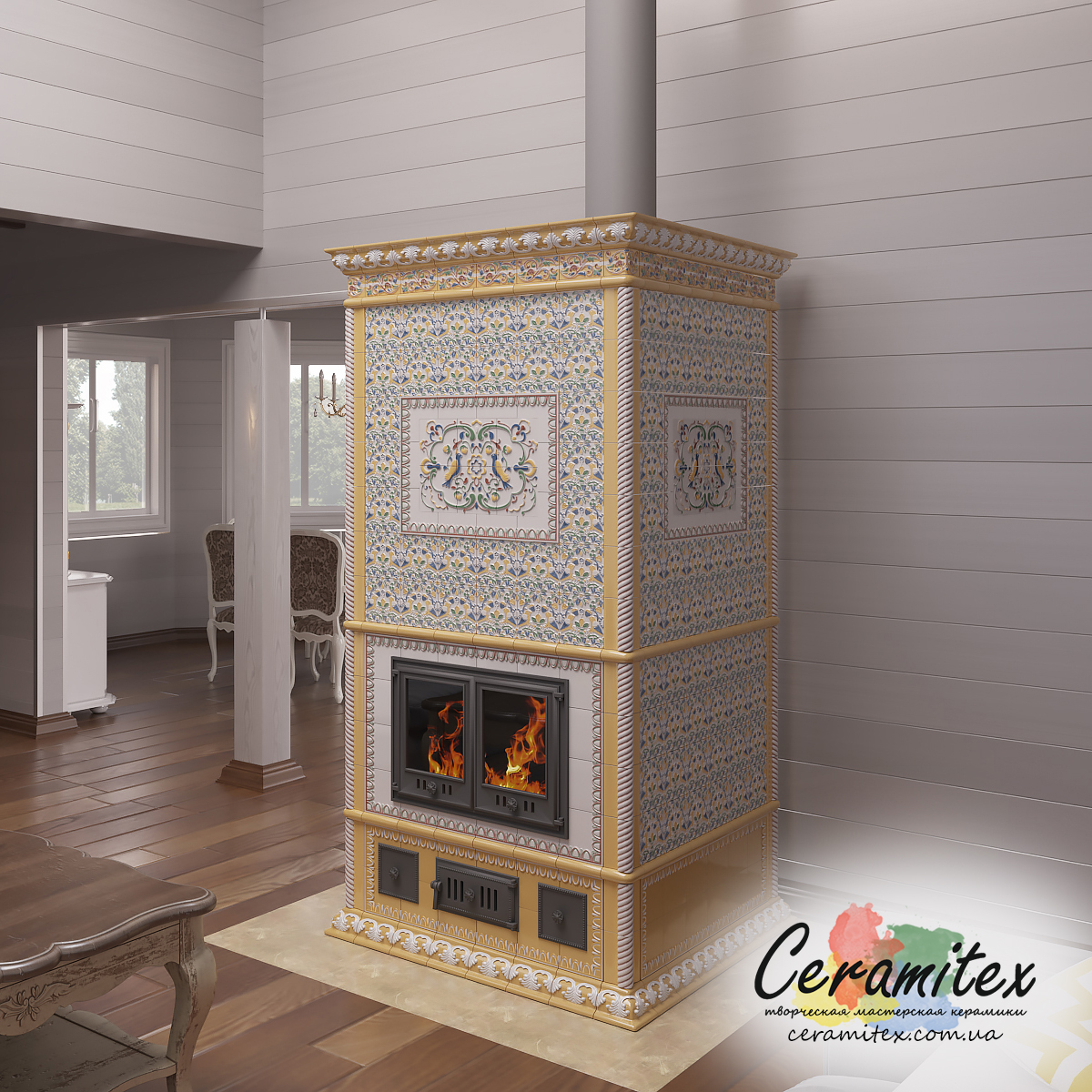 На изготовление и монтаж такого изразцового камина уходит не больше 3 месяцев. Установкой и запуском занимаются только наши специалисты. Обязательно предоставляется гарантия на комплектующие, изразцы. Дополнительные элементы для монтажа короба под облицовку, топку, труб дымохода и решетки вы найдете в разделе “Доп. оборудование”.