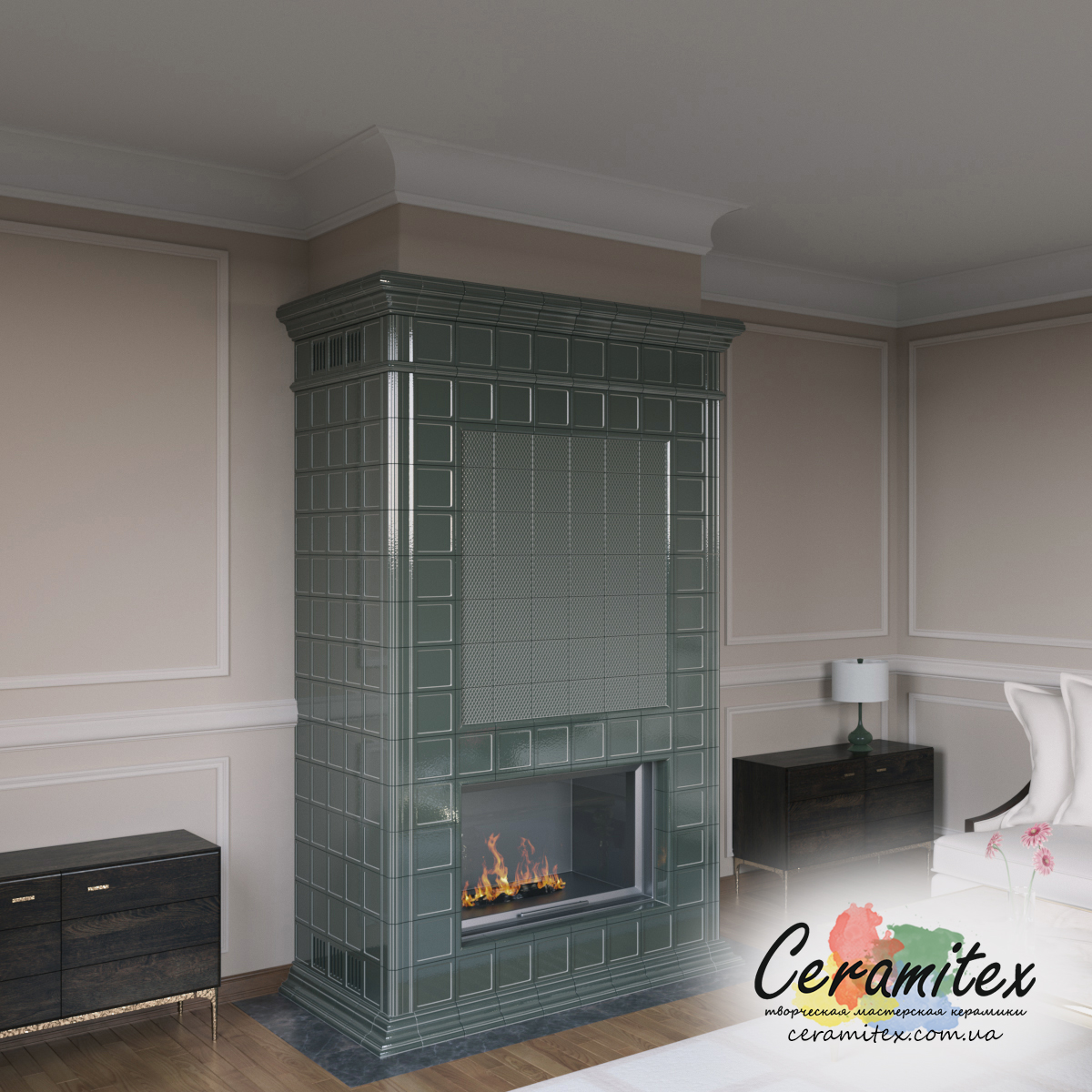 Очень элегантно смотрится в интерьере изразцовый камин “Альбион” цвета благородной оружейной стали. Его богатый внешний вид нам удалось эффектно подчеркнуть необычной формой портала. Акцентом стало сочетание тематических изразцов разных размеров и фактур. Контрастом послужил более светлый дымоход правильной формы. Для его облицовки мы использовали отделочные материалы, имитирующие натуральный полированный камень (мрамор).